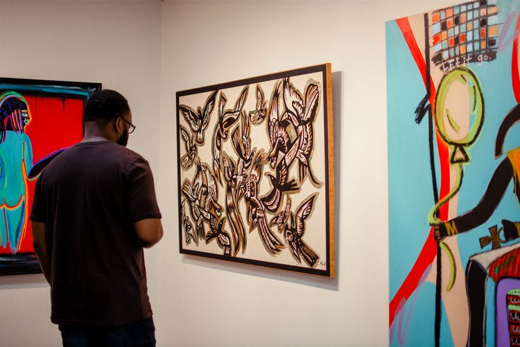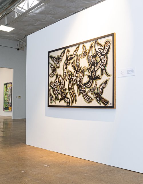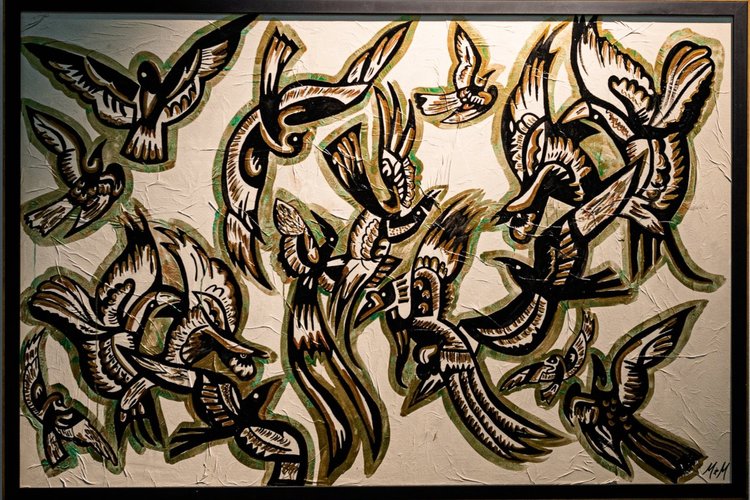 This painting is titled "Asfour", which means "bird" in Arabic. Birds are recurring symbol within four different pieces of this collection. They represent freedom and a connection to God. They fly close to heaven and intercede prayers on my behalf.