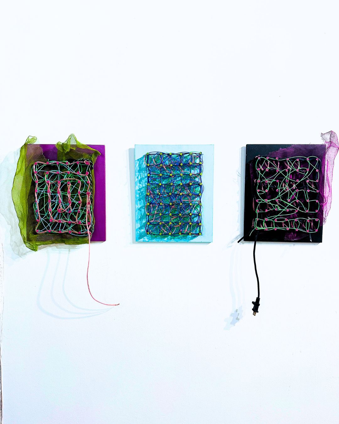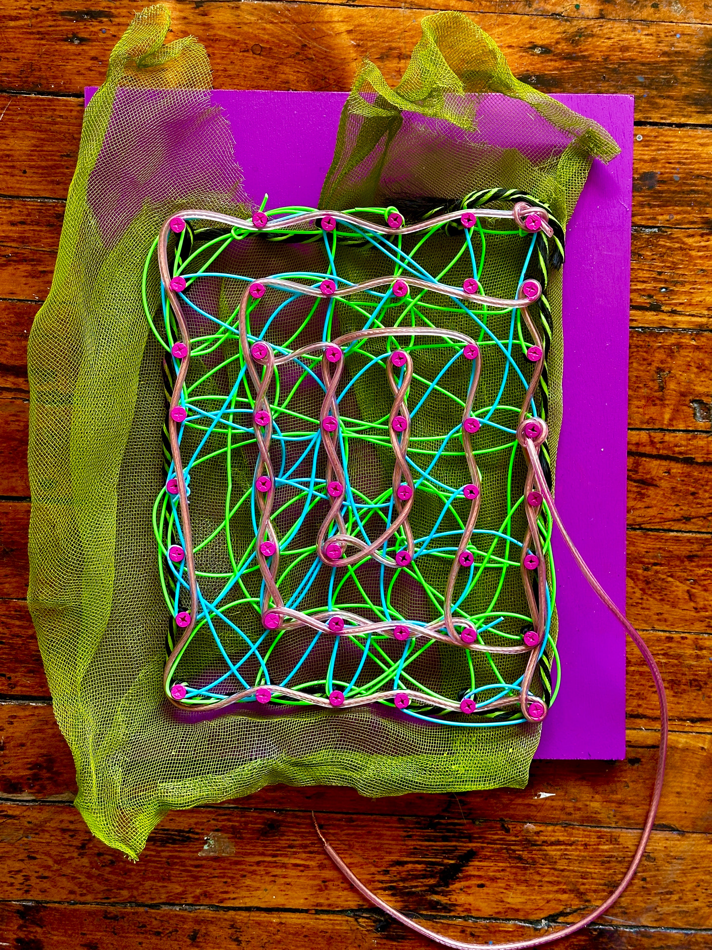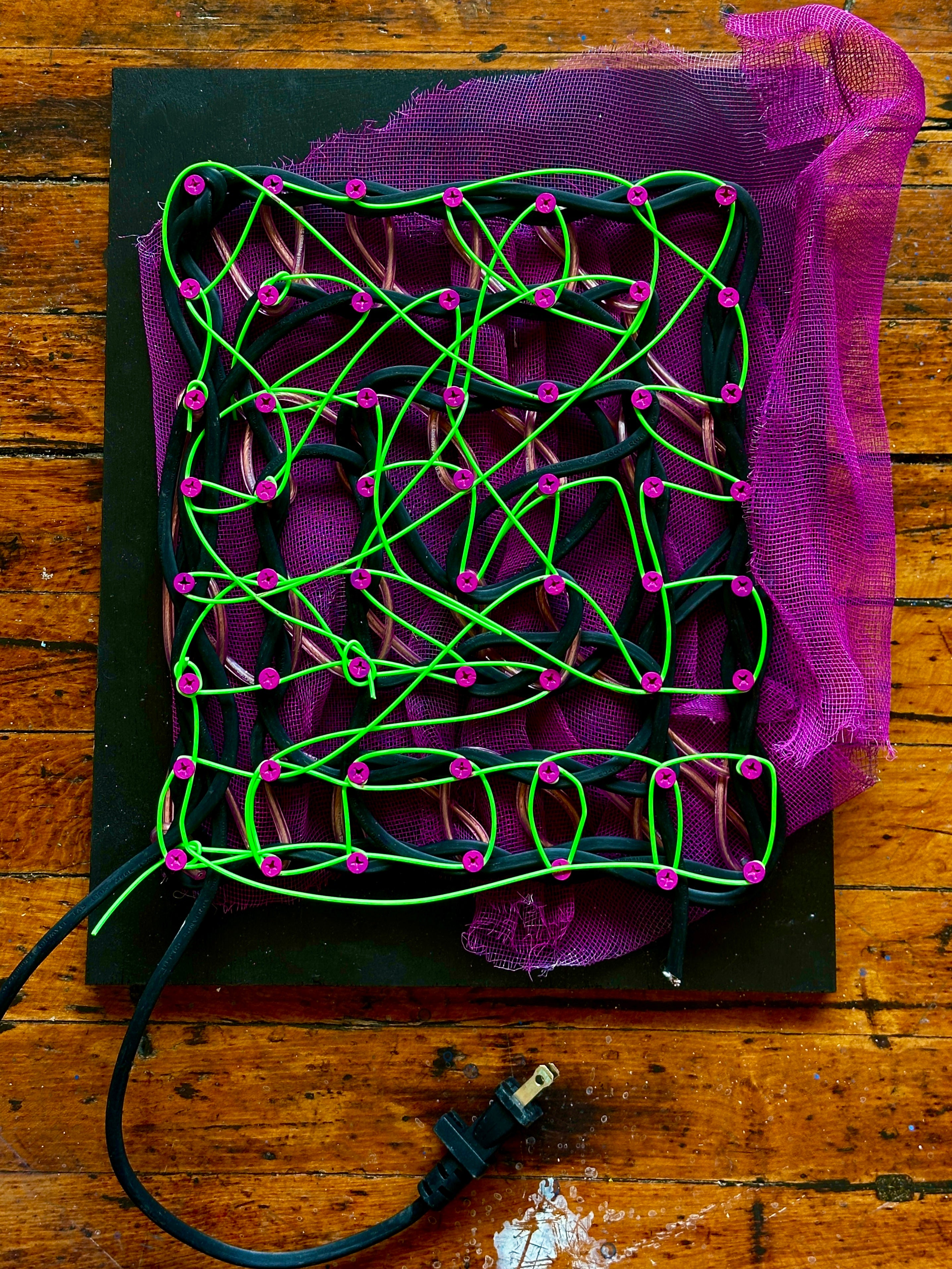 A dynamic fusion of reclaimed materials, this piece intertwines wood, screws, yarn, 3D printer filament, metal mesh and cable wiring to create a structured yet fluid composition. The interconnected lines and loops evoke networks of energy, communication, and the unseen forces that bind us, whether physical, digital, or emotional. Balancing rigidity with movement, The Network is a meditation on connection, both intentional and accidental, and the beauty that emerges from complexity. The structured gridwork, woven with vibrant filaments and bound by industrial materials, evokes networks of power, both electrical and metaphorical. The presence of the exposed cable wiring serves as a reminder of the unseen currents that flow through all systems, whether technological, social, or organic.