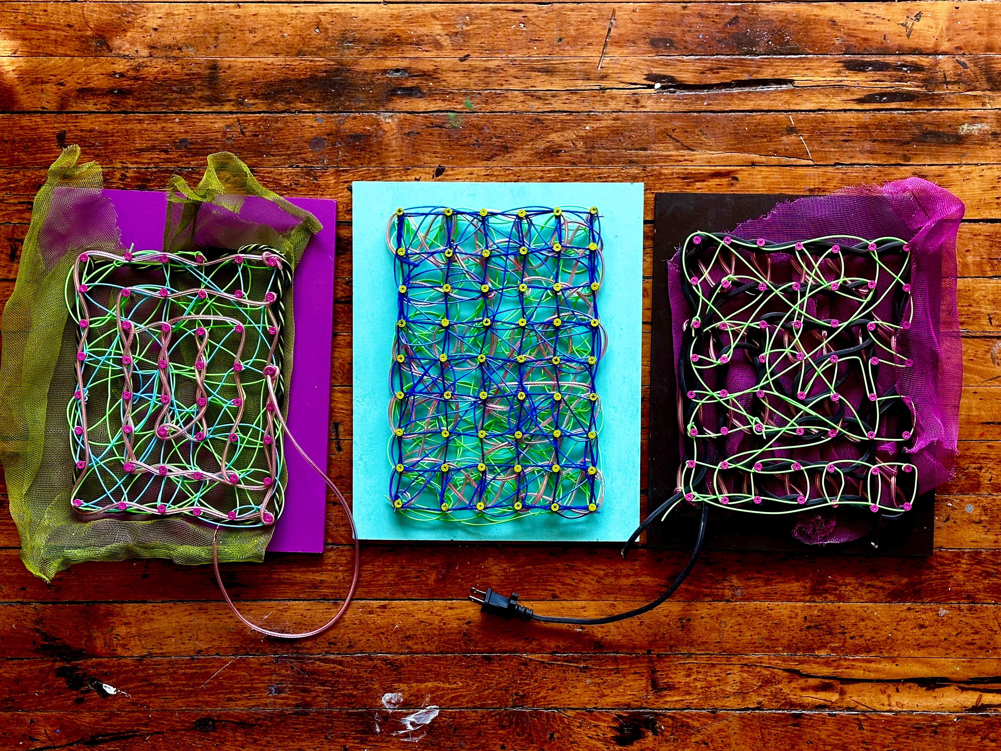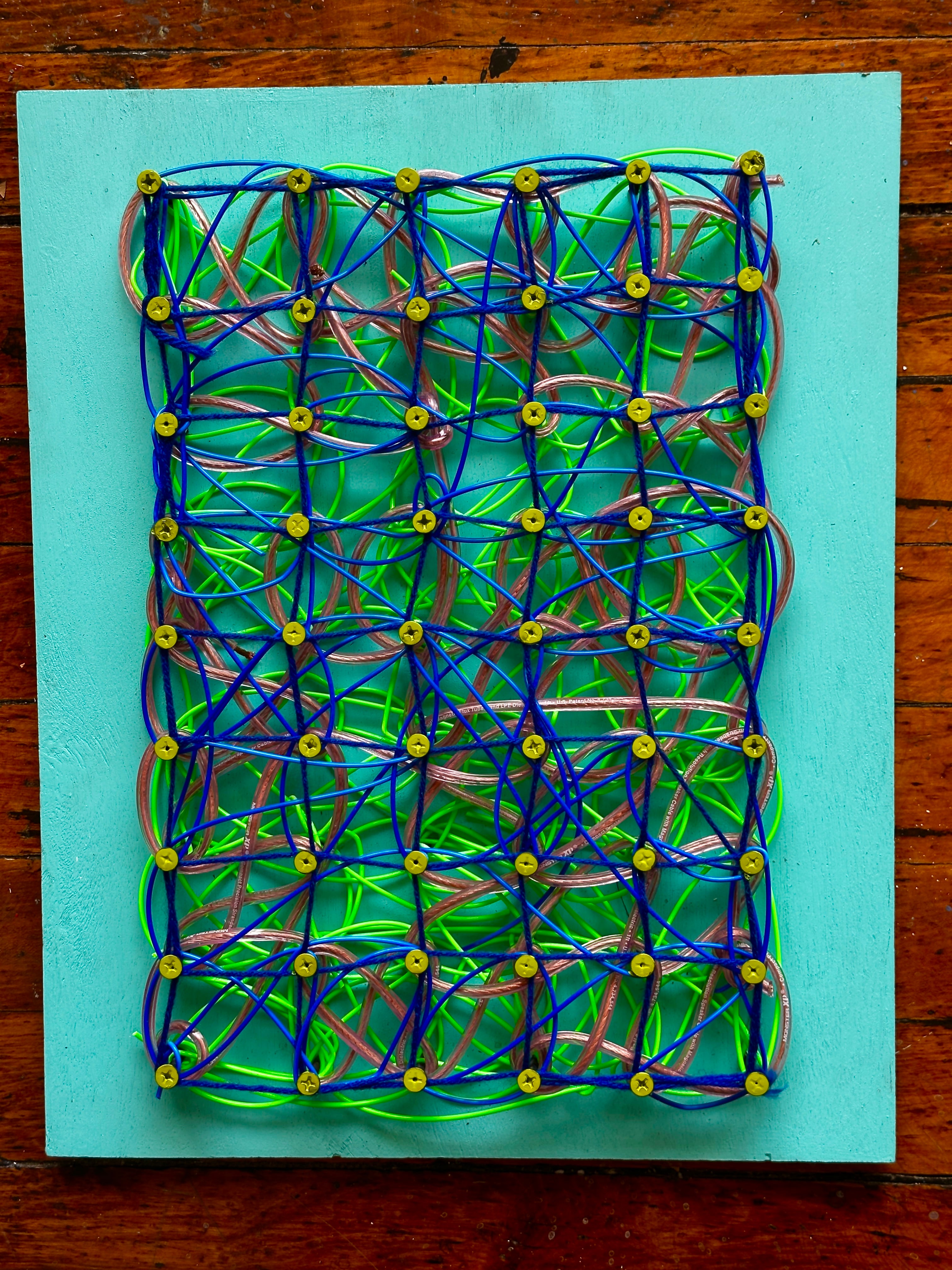 Screws, 3D Printer Filament, Yarn, Cable Wiring on Reclaimed Wood