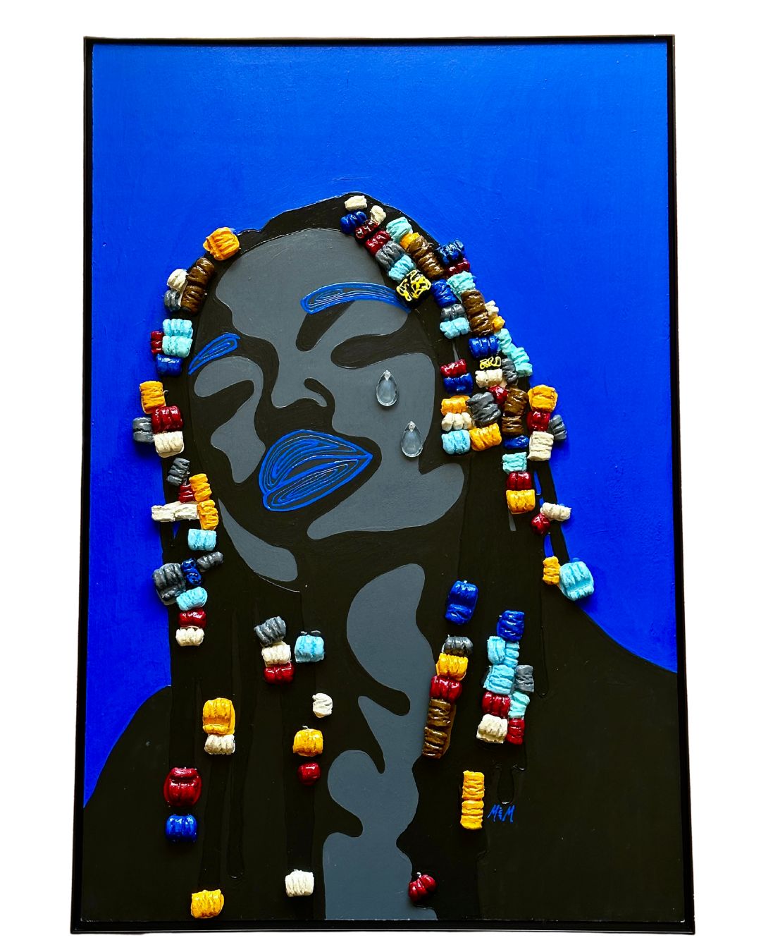 Woven into her hair, beads made from reclaimed styrofoam packing peanuts, embody strength—transforming what was once discarded into a symbol of cultural identity and adornment. Her tears, formed from glass chandelier droplets found at JunkLuggers of Greater Dallas, reflect both sorrow and strength, catching the light as reminders of what is carried, but never lost. Against the bold blue backdrop, she stands as a reminder that even the remnants of the past can be reimagined and celebrated, woven into the fabric of our being.