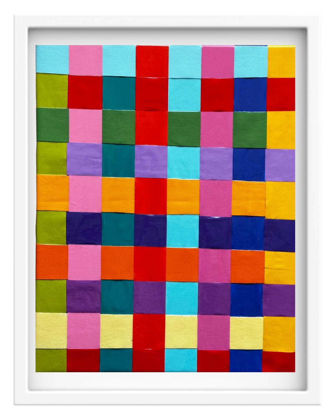 This vibrant composition is a tapestry of resourcefulness and collaboration, created by weaving together painted scraps of canvas found throughout the artist’s studio, and repurposed tape backing paper. Each intersecting piece represents the beauty of connection between materials, colors, and generations. This work is both a celebration of craftsmanship and a meditation on how fragmented elements can come together to form something whole, intentional, and full of life.