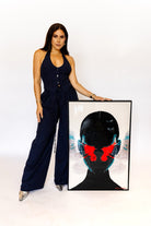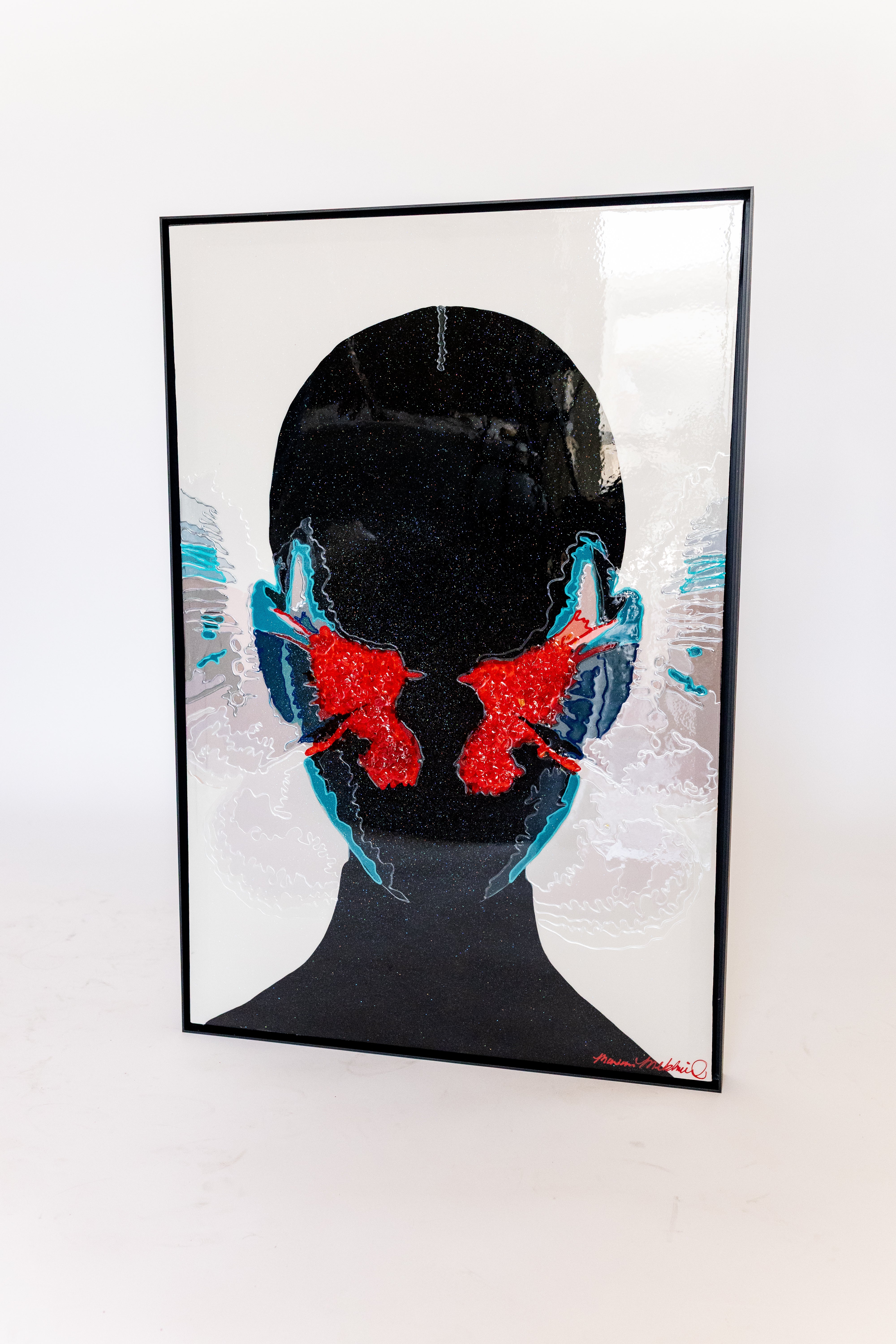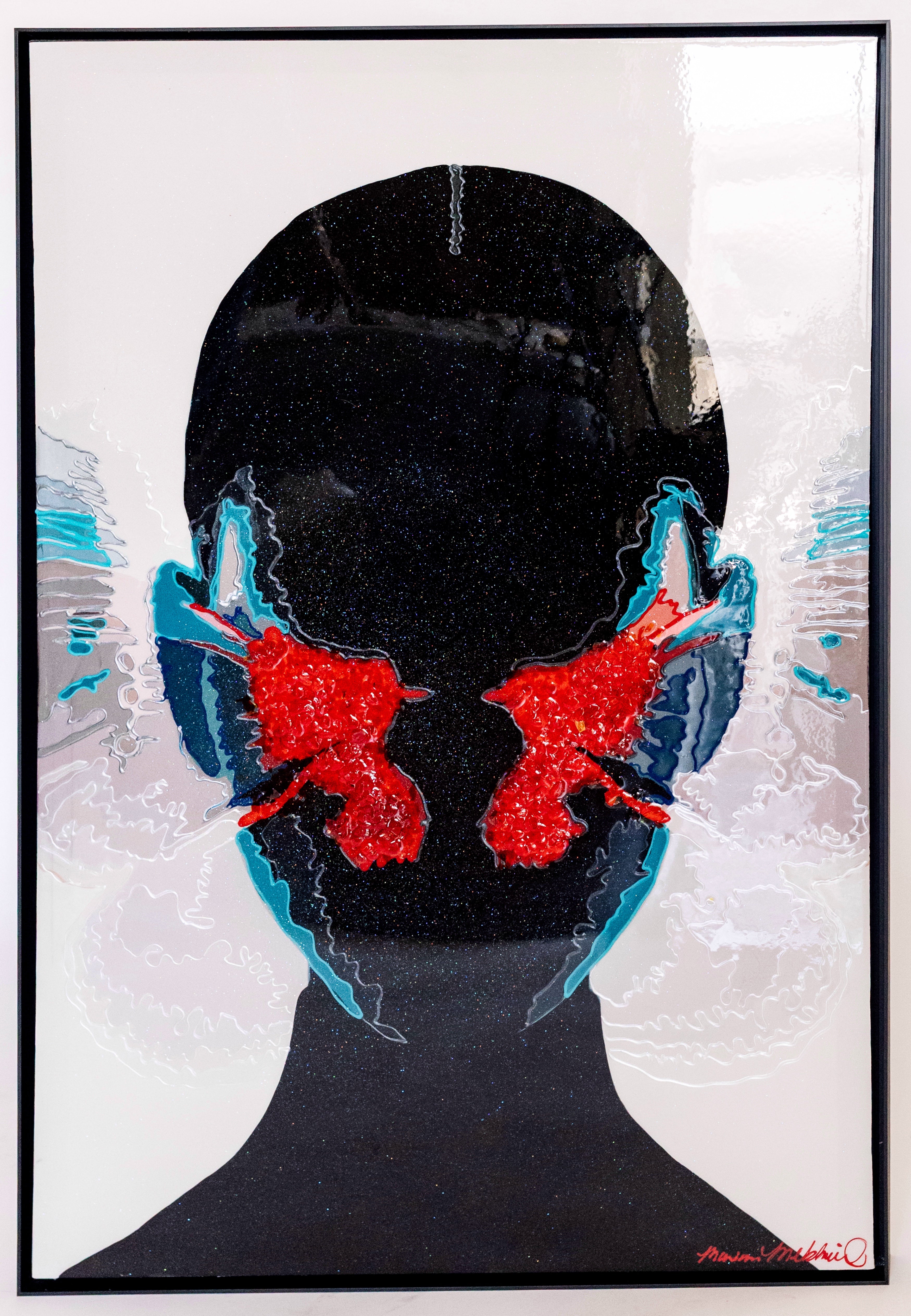 The butterfly wings burst through the figure’s face like something that couldn’t wait any longer. The symmetry isn’t perfect. The softness of the wings contrasts with the stark silhouette, they almost form birds taking flight. But that’s the point.