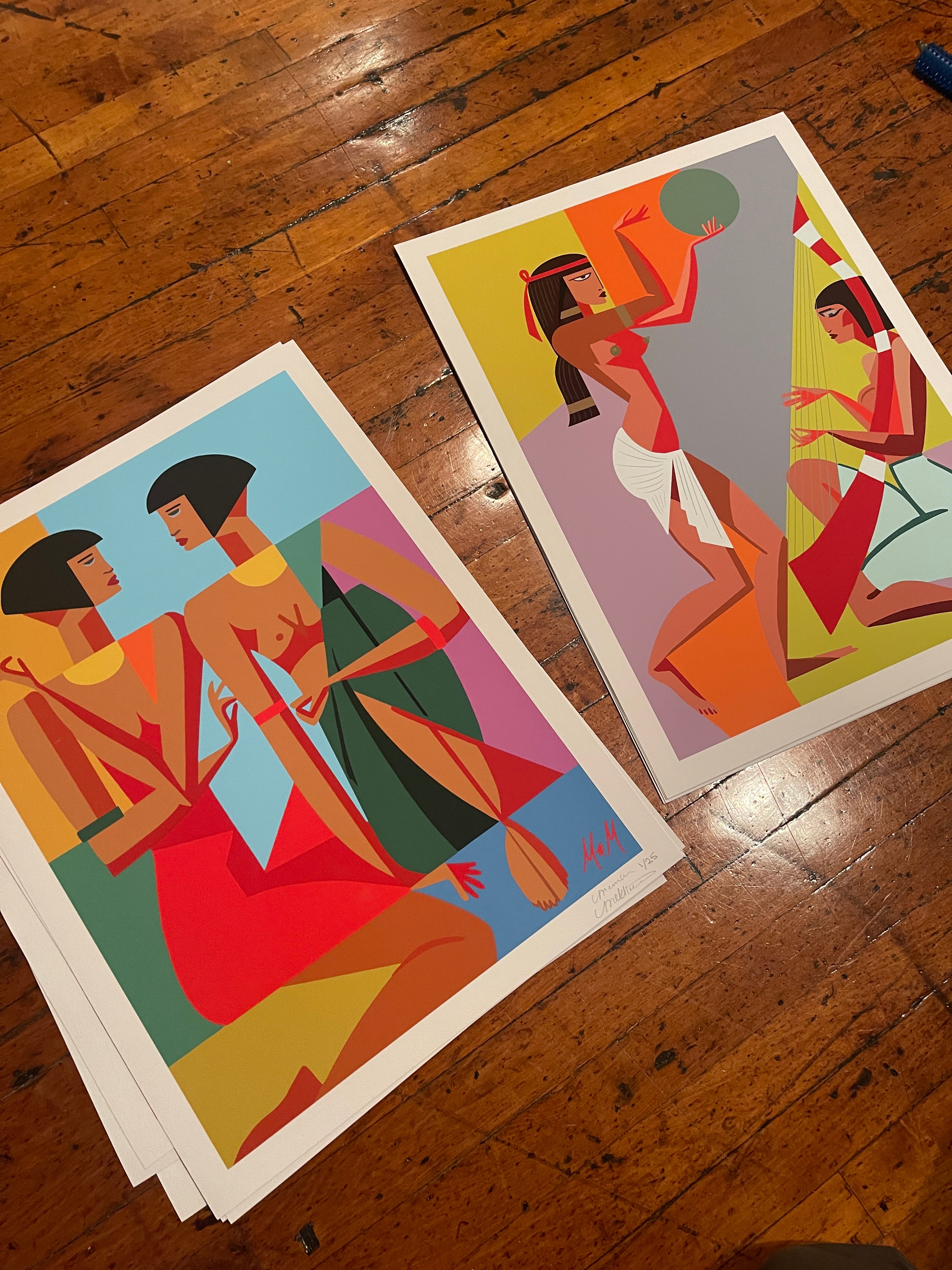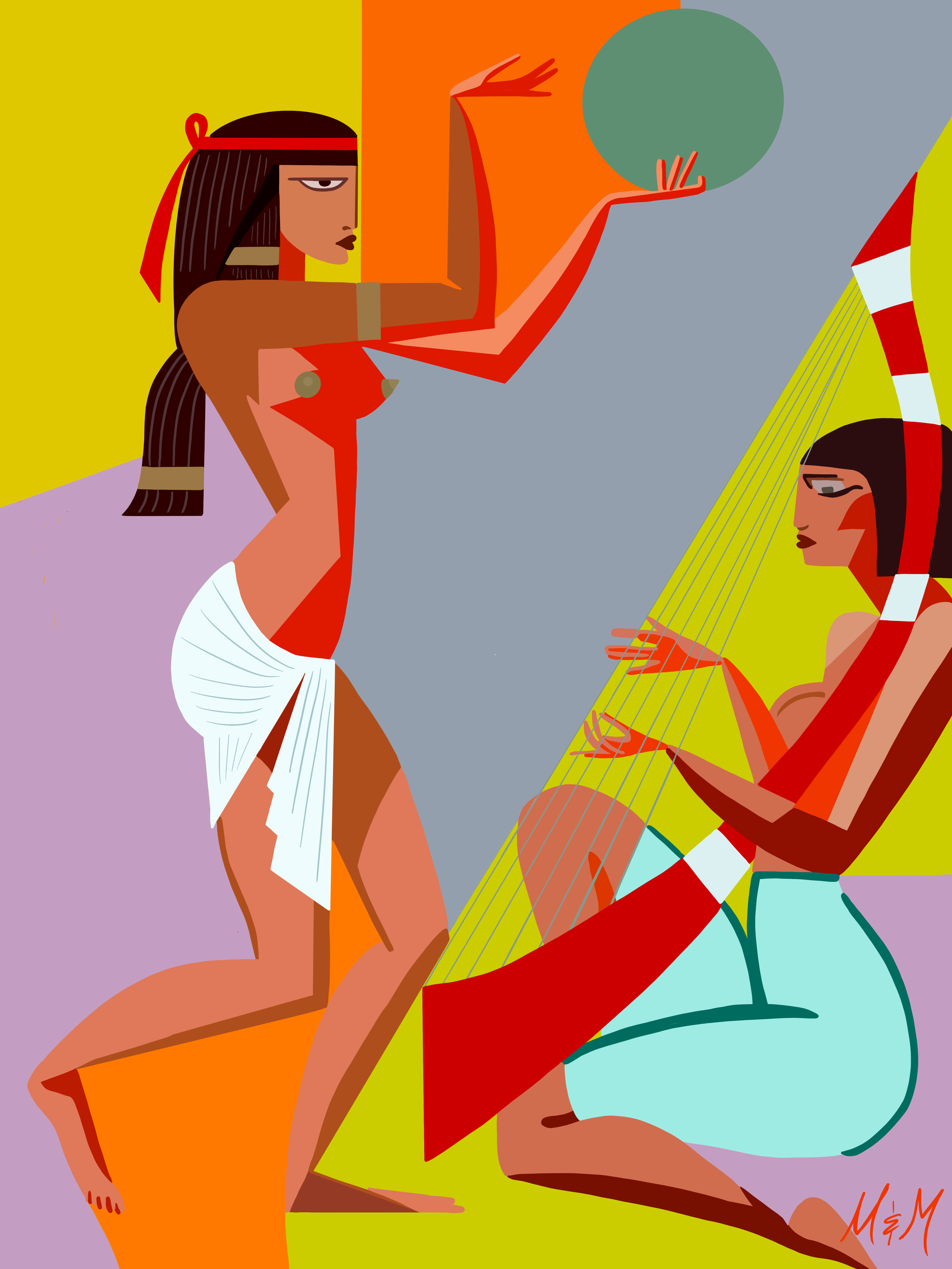 In ancient Egyptian imagery such as this, women are often portrayed simply as entertainment presented to the Pharaoh. In my modern take, these women exist for more than the pleasure of others. They move to their own rhythm and dance to their own tune.
