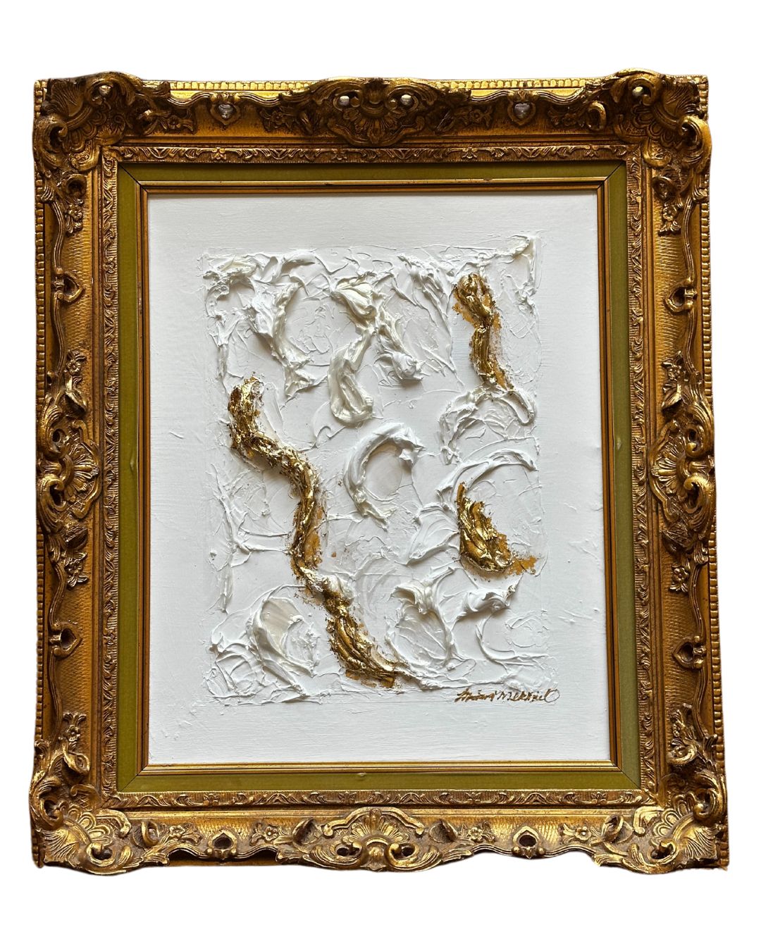 Layers of textured white and iridescent pearl rise and swirl, evoking a sense of a time-worn surface and forgotten stories. The delicate application of gold leafing highlights fractured edges, as if revealing something precious beneath. Encased in a salvaged ornate gilded frame, this piece blurs the line between antiquity and renewal, transforming remnants of the past into something luminous and enduring. A balance between antiquity and modernity.